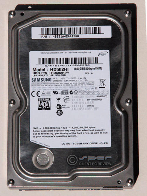 While all of these various models are interesting, the F2 HD502HI is the most compelling because it is a single platter 500GB drive. The conventional wisdom is that the fewer the number of platters in a hard drive, the lower the noise, heat and power. It doesn't always hold true because manufacturers sometimes change not only the number of platters, but also the casing and other aspects of the drive that impact noise. For example, a single platter takes up less room and weighs less, so sometimes a less substantial casting is used, with the result that the drive ends up vibrating more and making more noise.In accordance with conventional wisdom, the F2 HD502HI does, in fact, have the lowest specified noise of all the EcoGreen models. It is rated for 2.2 bels (sound power) in idle and 2.7 bels in performance seek; the same parameters for the lower capacity F1 models are 2.45 bels and 2.8 bels.The 500gb/disk areal density is the current peak, reached not only by Samsung but also Western Digital and Seagate. It is the first single-platter 500GB model to be tested here.Although the buzz in the SPCR forums is that the EcoGreens are very quiet and offer good performance (see forum thread Samsung EcoGreen F2 500GB platter is out!), Samsung has been unusually mum about the entire EcoGreen series thus far, at least in the retail space. Not only is there no PR and marketing effort, there is simply no distribution in Canada. Luckily, both the US and the EU have access to the EcoGreen line. A SPCR forum member who lives nearby decided he'd order a pair of the HD502HI from Newegg.ca (which actually ships the drives from the US) and have it delivered directly to SPCR for review and analysis for a few weeks before he took possession of them. It was "frEEk"s thoughtful initiative which allowed us to get to this review.