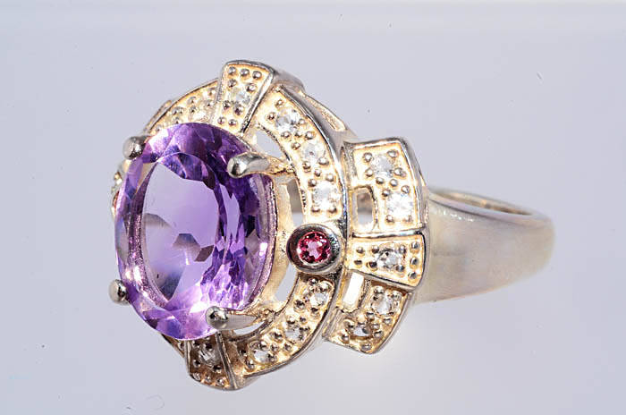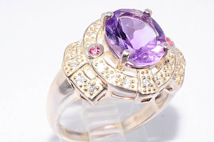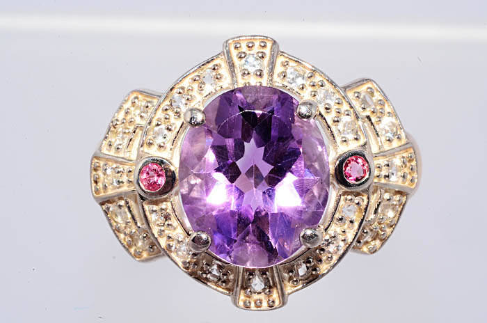 $500 5.35CT OVAL CUT AMETHYST,ROUND CUT PINK SAPPHIRE & WHITE TOPAZ RING sz 9