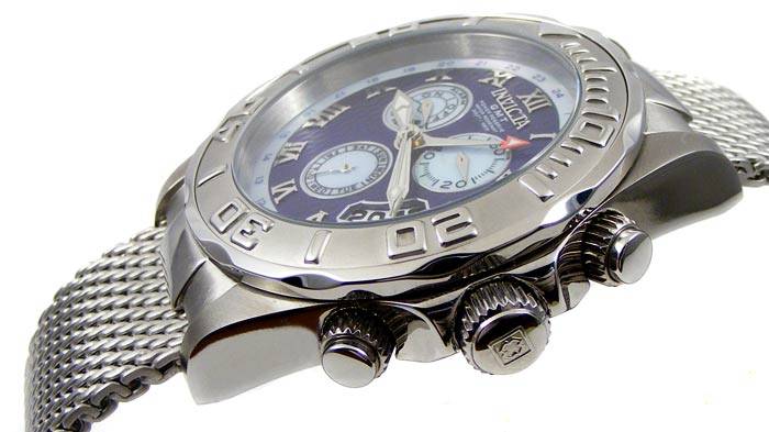 Surgical stainless steel case in a polished finish, with INVICTA engraved on the side of the case.