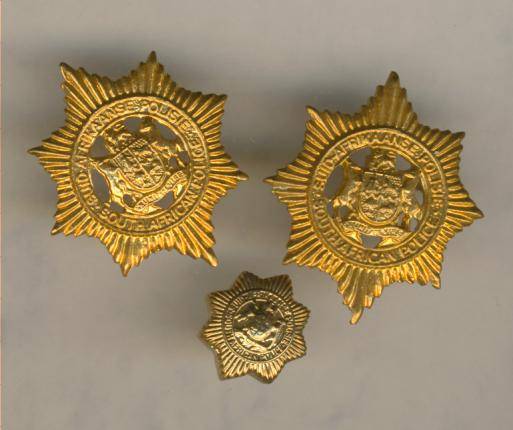 Gilded brass pin-backed badges with collar badges measuring 32 mm T - B