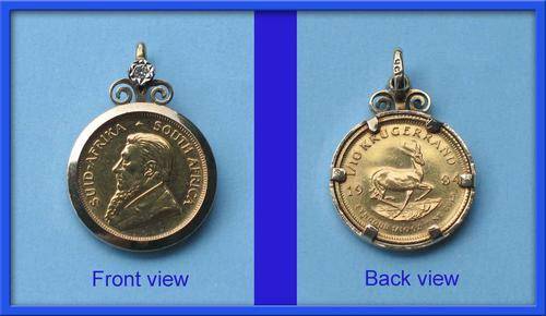 1/10th 22 CARAT GOLD KRUGER RAND WITH ONE DIAMOND PENDANT - IMMACULATE CONDITION. SET IN 9 CARAT GOLD. DATED 1984.