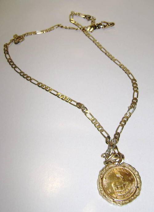 You are bidding on a stunning items - A 1/4Oz 22ct Gold Kruger Rand set in 9ct Gold Pendant with 18 small Diamonds - It also comes with a thick 9ct gold chain ( Stamped ) - The chain alone weighs in at 24.5 g of 9ct gold