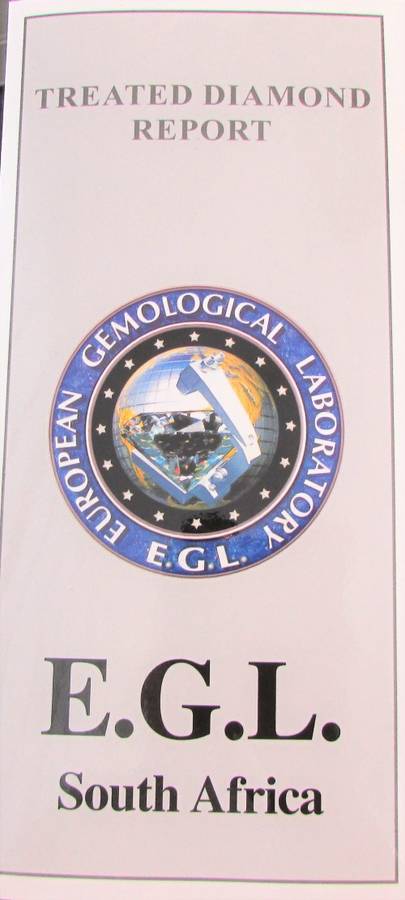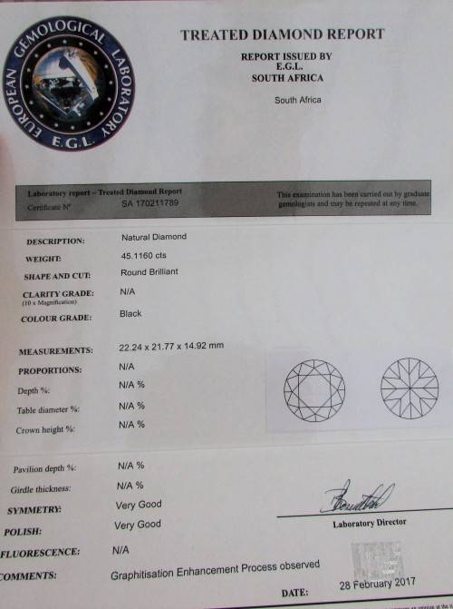 This is the original Diamond Certificate. Its rare to find diamonds in this size. The treatment that is referred to on the certificate relates to a colour treatment to even the black on the diamond. The diamond however is NATURAL!!