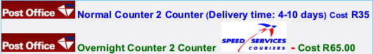 R35.00 Standard shipping using one of our trusted couriers applies to most areas in South Africa. Some areas may attract a R30.00 surcharge. This will be calculated at checkout if applicable.
