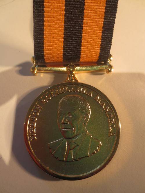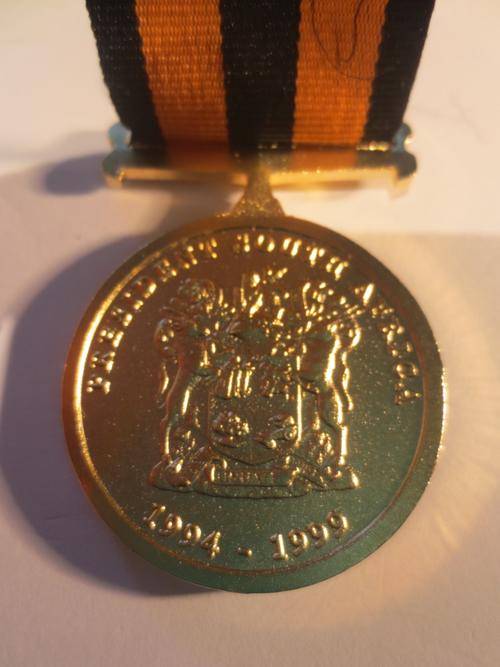 South African " PRESIDENT NELSON MANDELA " medal in a GOLDEN colour metal, the revese carries the old South African Coat of Arms with the wording PRESIDENT SOUTH AFRICA 1994 - 1999.