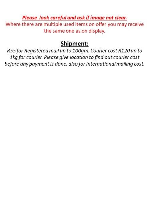 R65.00 Standard shipping applies to orders under R100.00, in most areas in South Africa. R35.00 Standard shipping applies to orders over R100.00. Some areas may attract a surcharge surcharge. This will be calculated at checkout if applicable.