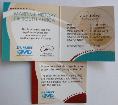 ** 2009 Proof Sterling SILVER Tickey - Maritime History of S A with COA ** - Mintage 646 sealed