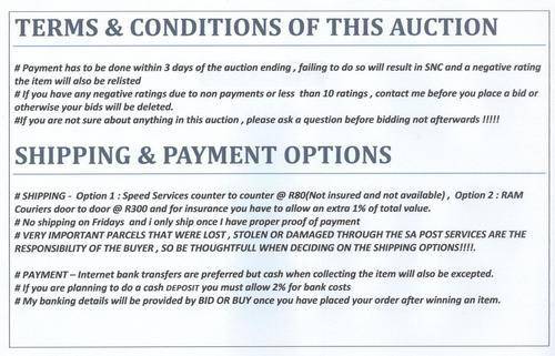 PLEASE READ THE TERMS & CONDITIONS OF MY AUCTIONS , IF YOU DO NOT AGREE WITH ANYTHING PLEASE DO NOT BID. ALL SHIPPING QUOTATIONS ARE UP TO 1KG IN TOTAL WEIGHT.