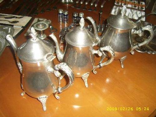 3 LARGE FRUIT BASKETS (EPNS), 6 TEASPOONS, & SUGAR TONGS, 2 PLATED COFFEE POTS, 1 PLATED TEA POT