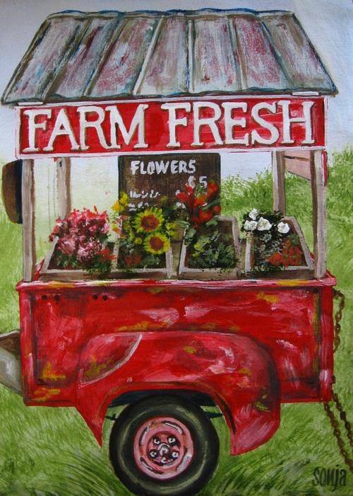 Acrylics on canvas sheet -  Flowers for sale - 21 x 29.5cm - Artist: Sonja Peacock - This painting needs to be framed