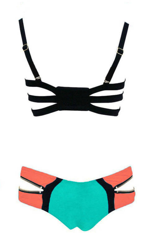 Soak up the sun the sun in head turning beachwear. The sexy retro inspired colour block bikini top is lightly padded with a functional zip up closure in front and a lined bikini bottom. Material: Nylon and Spandex