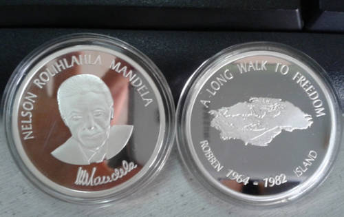 4 coins have the face of Mandela, his full name and on the back of the coin a picture of Robben Island as well as the dates Mandela was on Robben Island.