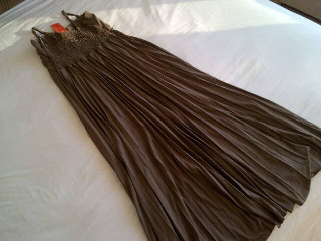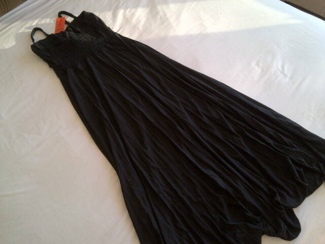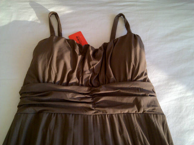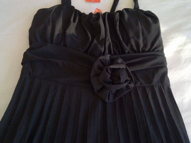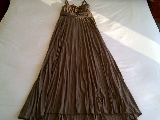 Beautiful Ladies Long Silk Style Strap Dress With Frill Like Design & Rose Pin, has a stretch just below the bust area to accommodate different shapes and sizes, stunning piece, great quality item..