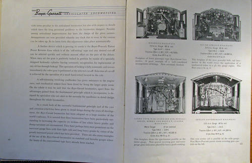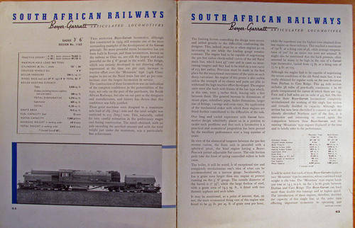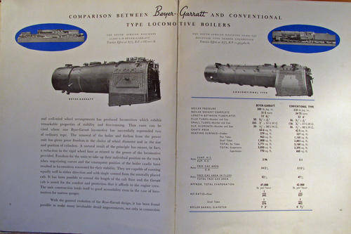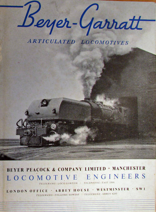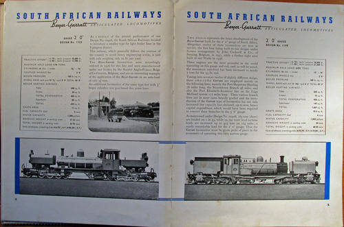 This 164-page Beyer-Peacock Catalogue was published in about 1947/48 and details (specifications & photos) Garratt locomotives supplied to over 60 railway systems around the world, from 2ft gauge to 5ft 6in gauge. South Africa is particularly well covered (3 types of NG locos & 6 examples of 3' 6" Garratts). Classes GL, GM & GEA are dealt with in additional detail, the GEA taking up 8 pages, with 8 action photos, including line profile diagrams, of these locomotives during trials on the Mossel Bay-Oudtshoorn section and the Natal North coast.. This is a very rare volume in 2014.