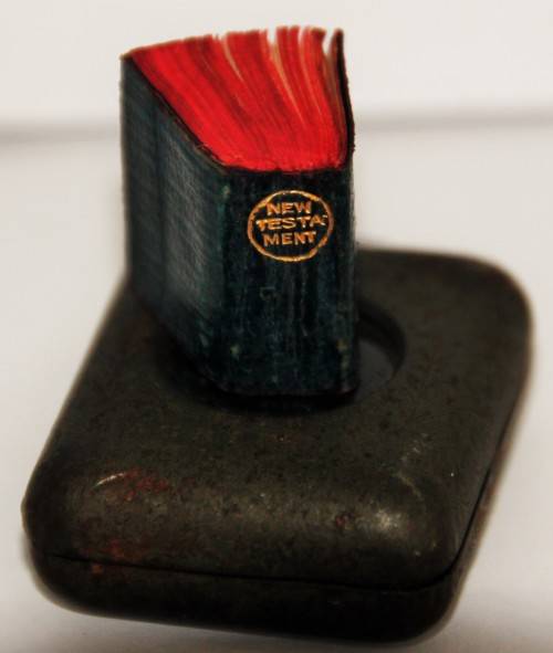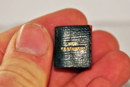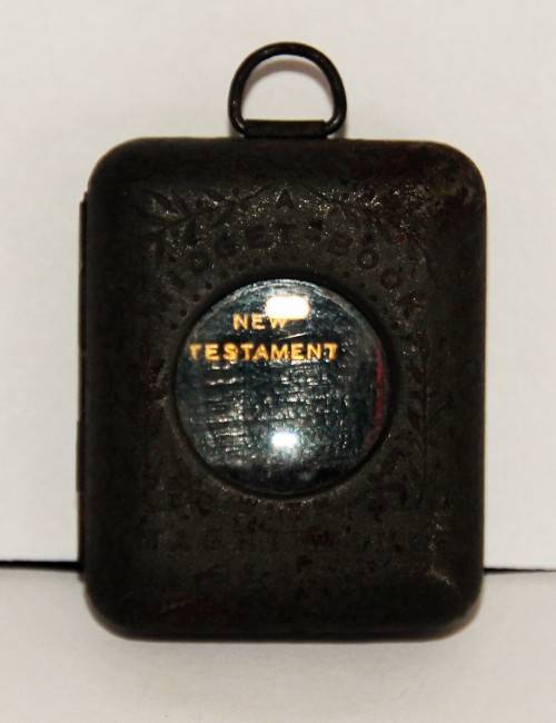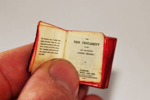 On offer is a highly unusual miniature New Testament Bible, housed in a hinged case with an integral magnifying class. The front and rear of the case are marked 'A Midget Book With Magnifying Glass' and there is a suspension loop to the top. The book is only 18mm (¾") high and is of green leather with gilt lettering. It was published by David Bryce & Sons of Glasgow in 1895 who's works are prized for their clarity and legibility.