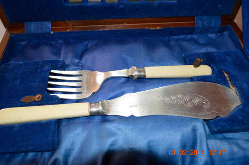 An Old Set of Bone Handle Fish Eaters Flatware, comprising The Large Knife and Fork, Six Fish Knives and Six Forks in great condition. The knife blades Beautifully Monogrammed and Stamped Maker and epns. Stunning for it's age!! The case shows wear and would require a little attention in places.