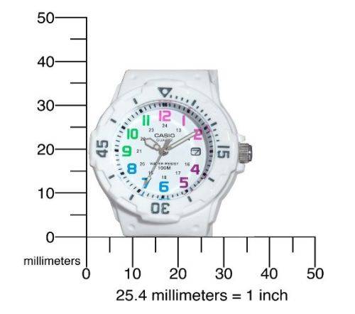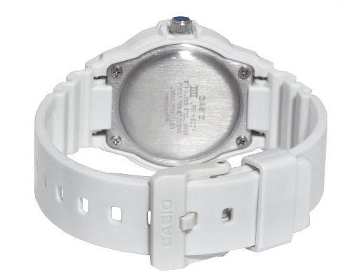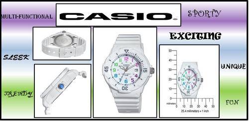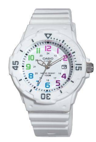 Casio watches are known for their innovative design, multi-function and sporty features which are perfect for an active lady who doesn't just want her watch to tell the time but to make a statement in her busy lifestyle. If you're searching for great value in a classic diver-look watch, look no further than the LRW200 from Casio. Its 32mm face and large indexes provide at-a-glance information. Couple this with a bi-directional rotating bezel and 100 meter water resistance and you've got a timepiece that's easy-to-read, simple-to-use and durable. White resin band analog watch with a white face and multi-colour markers make this watch pretty as well as convenient.