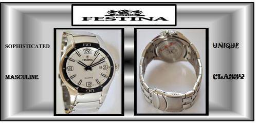 The Festina brand is awarded with an acknowledged international prestige. With over a century of experience as high quality watch-maker Festina offers timeless designs. As a synonym of elegance, style and functionality, it is positioned as a brand for good taste and stylish people who like to live enthusiastically and get the best of life. Festina is aimed at those of a sporty spirit and dynamic nature. Festina goes hand in hand with sport, everyday life and is always there when the most important events take place throughout life. This classy watch stays true to the Festina brand with it's elegance and unique design. The round case is filled with a white dial with black accents and luminous markers. This beautiful watch is striking and is sure to make a statement!
