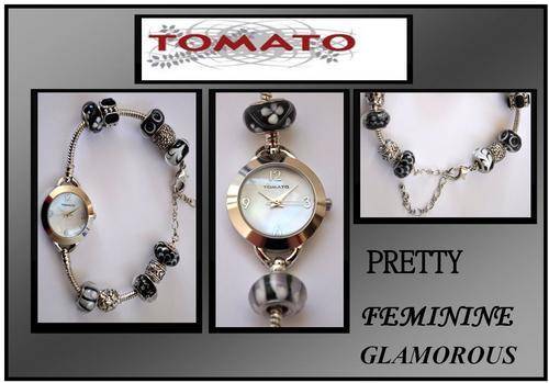 Tomato watches are known for their trendsetting style and affordable prices. This glitzy and glamorous watch is perfect for a lady who likes to make a statement. The black and white beads stud the bracelet band making it not only a watch but a piece of jewellery. The simple white dial is a perfect match to the beaded band. Perfect for any outfit on any occasion.