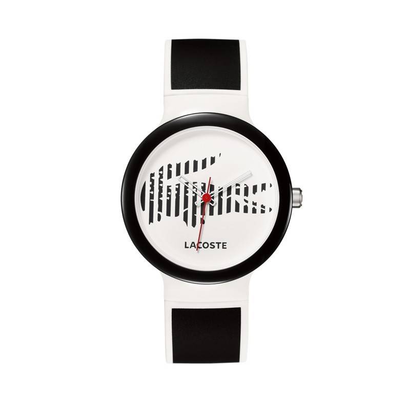 The LACOSTE art of living expresses itself today through a large collection of apparel for women, men and children, footwear, fragrances, leather goods, eyewear, watches, belts, home textiles, and fashion jewelry. LACOSTE found its' success on the essential values of authenticity, performance, and elegance. The crocodile incarnates today the elegance of the champion. Part of the day glow goa collection this beautiful watch has a black silicone strap, with a black and white dial which accentuates this bold timepiece.