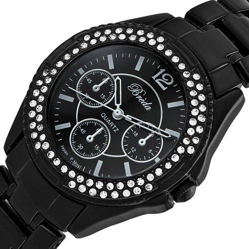 The "Keira" watch by Breda is fashion accessory that will say it all. You can check the "it" fashion piece off your list when you purchase this watch. The black dial is accented with clear rhinestones that will be sure to give your wardrobe a sleek look. The dial is marked with contrasting clear hour markers. Clear non-working subdials create a chronograph look. A three link black metal band holds tight on your wrist with a jewelry clasp.