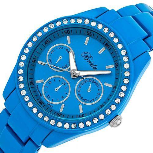 The Breda Women's "Lexington" Rhinestone Accented Bezel Metal Blue Watch tells more than just time, it tells everyone who sees it that you are classy, fun, and a trend setter! The bezel is encrusted with rhinestones and encases a blue dial, which is protected under a mineral crystal. The dial features contrasting time markers, three non-working sub dials, and contrasting hour, minute, and second hands. The "Lexington" sits comfortably on your wrist with a blue three-link metal band ending in a jewelry clasp. The watch is powered by reliable Japanese quartz movement and offers water resistance up to 99 feet, however it is not recommended for water or shower use. Slip this watch on for an instant chic look.