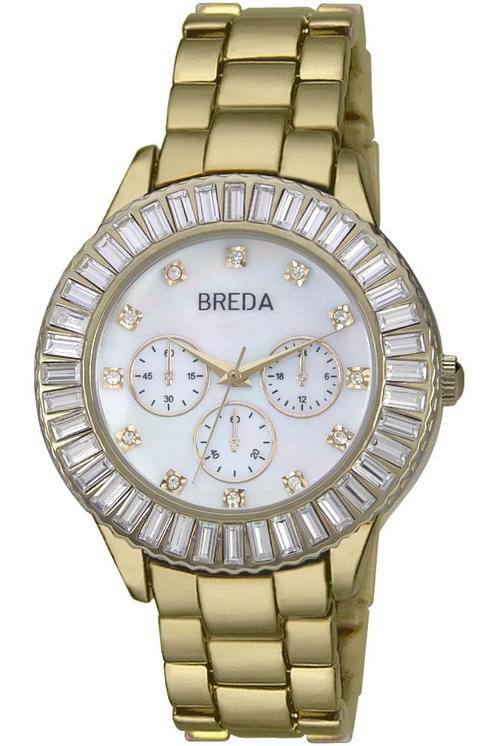 The Brandi watch by Breda is a glamorous design with a bling bezel featuring baguette stones. The white mother of pearl dial is outfitted with rhinestone hour markers and three non working sub dials. A three link gold metal band holds tight to your wrist with a fold over clasp and push buttons. 41mm Case Size.