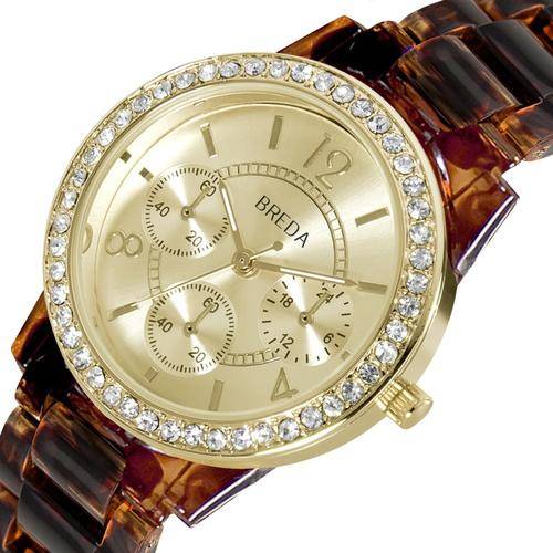 The "Vanessa" by Breda is a boyfriend inspired timepiece. This watch is classic in style but given a feminine touch with rhinestones on the gold bezel and lugs. The gold dial is outfitted to look sporty with three gold sub dials. A three link tortoise shell metal band holds tight to your wrist with a fold over clasp and push buttons. 36mm case diameter.