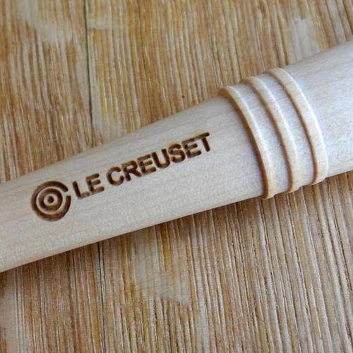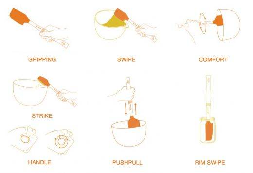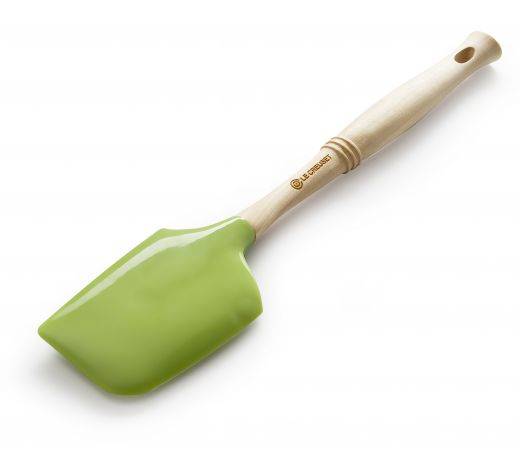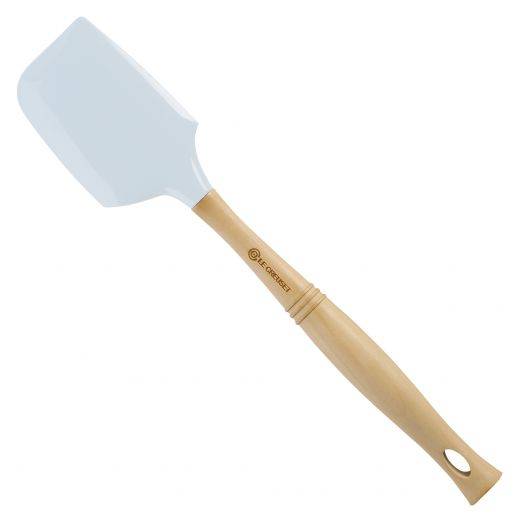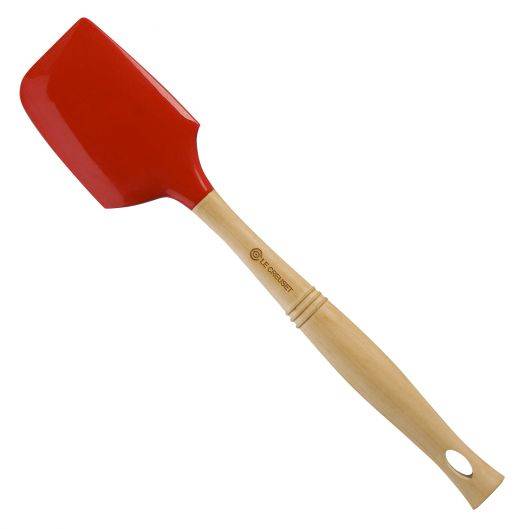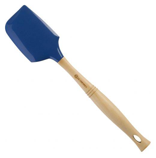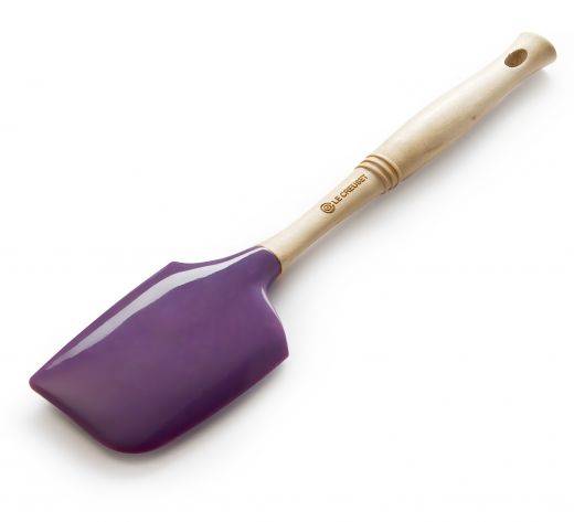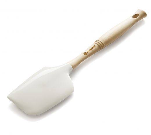 A large spatula with a dual sided blade, curved for skillets and bowls, straight for cocottes and casseroles.