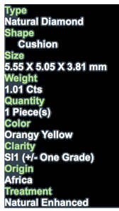 INDICATIVE ESTIMATED MARKET VALUE FROM ANTWERP WORLD DIAMOND CENTRE STATES VALUE OF APPROX. R310824 (SEE IMAGE SHOT RETAIL PRICING BELOW (HIGHLIGHTED IN BLUE) IN USD FOR THIS ENHANCED NATURAL DIAMOND) - WE HOLD THE RIGHT TO CLOSE AUCTION EARLY!