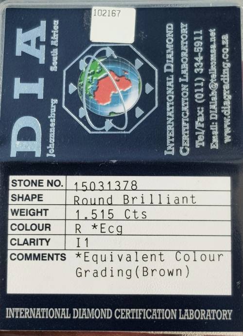 Stunning 1.515ct Round Cut Diamond at a once-off R1 no reserve. High quality workmanship on this ring guaranteed. Set in a 6 claw designer collet. The diamond has a fantastic sparkle and its independently certified by one of the country's leading labs. A ring with a genuine certified diamond is surely not to be missed out on!!