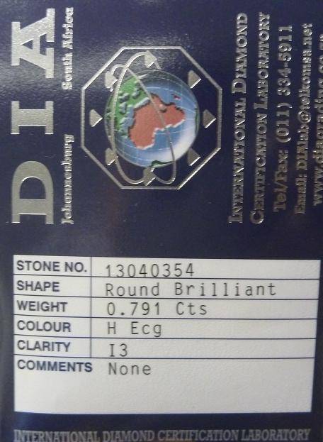 CENTRE STONE: 0.791ct ROUND CUT DIAMOND H / I3 (DIA 13040354)