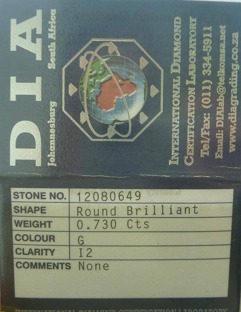 CENTRE STONE: 0.730ct ROUND CUT DIAMOND G / I2 (DIA CERTIFIED)