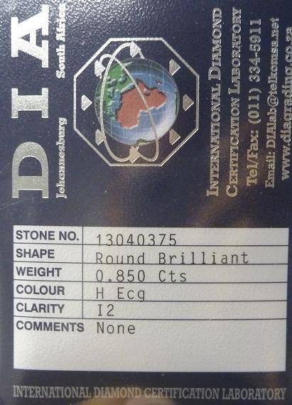 CENTRE STONE: 0.850ct ROUND CUT DIAMOND H / I2 (DIA 13040375)