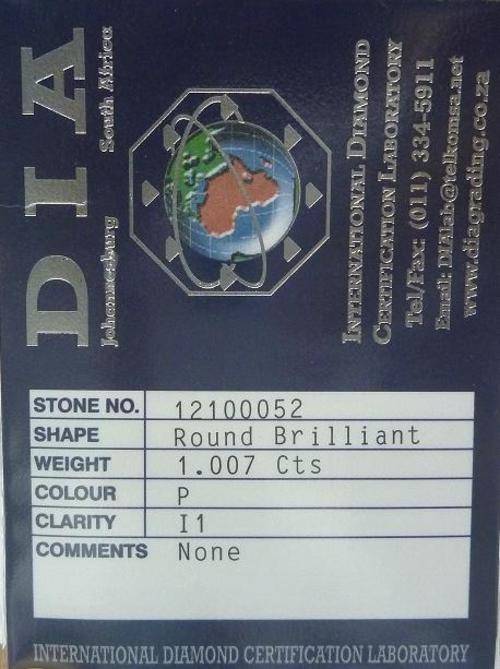 CENTRE STONE: 1.007ct ROUND CUT DIAMOND P / I1 (DIA 12100052)