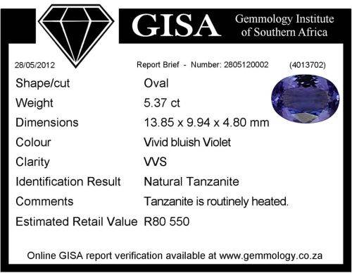 **CERTIFIED [R80550]** GORGEOUS [5.370ct] NATURAL TANZANITE - BUY SAFE
