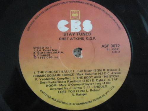 On offer is this "CHET ATKINS, STAY TUNED +GEORGE BENSON; EARL KLUGH; MARK KNOPFLER & STEVE LUKATHER CBS STEREO LP IN EXCELLENT CONDITION!