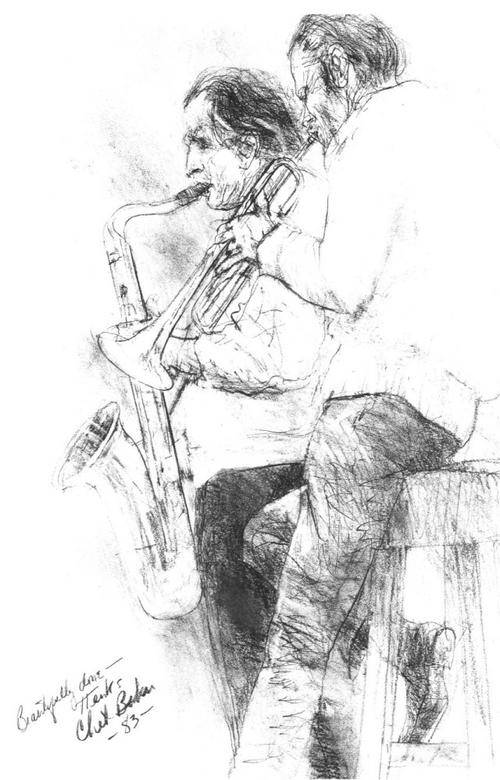 This is a high-definition copy of a drawing done in pencil of the famous jazz trumpeter, Chet Baker, during a concert in Amsterdam, The Netherlands. The saxophone player is in all likelihood the legendary Stan Getz (see the accompanying photograph taken during a concert) which was taken from a slightly different angle.