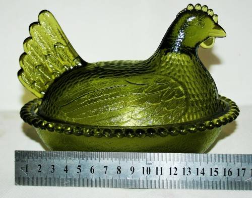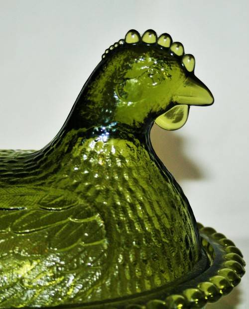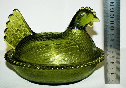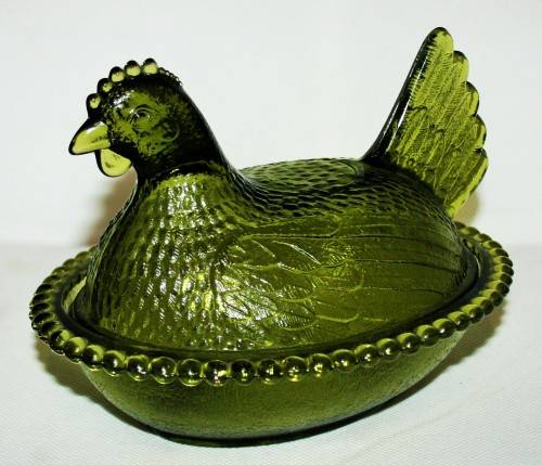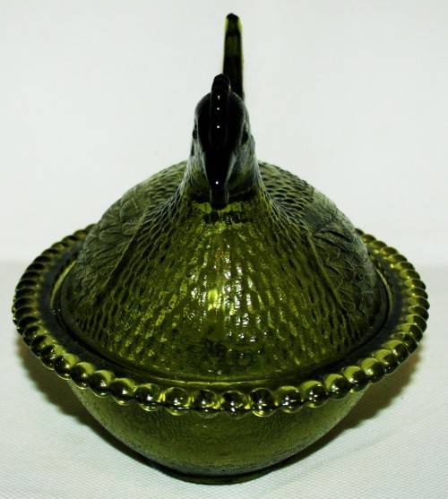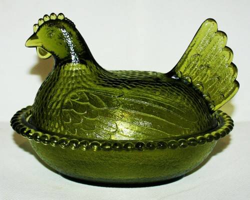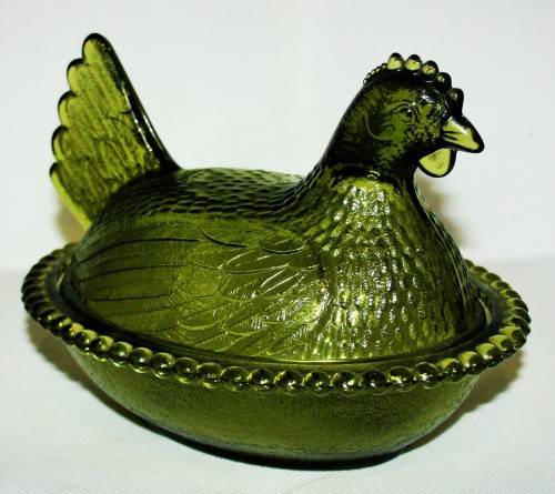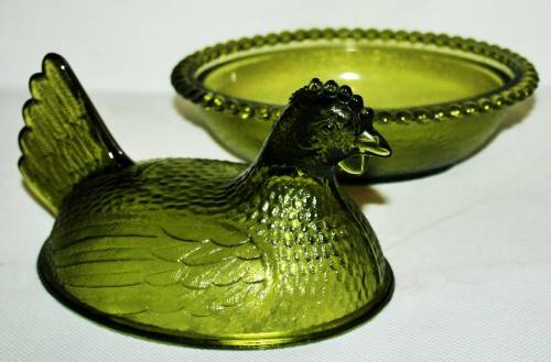*CHICKEN *A RARE AND COLLECTIBLE VINTAGE AVOCADO GREEN INDIAN GLASS COMPANY HEN ON NEST DISH