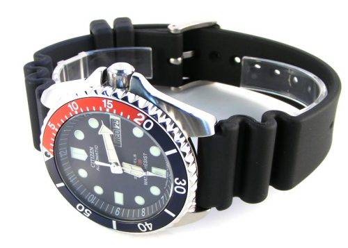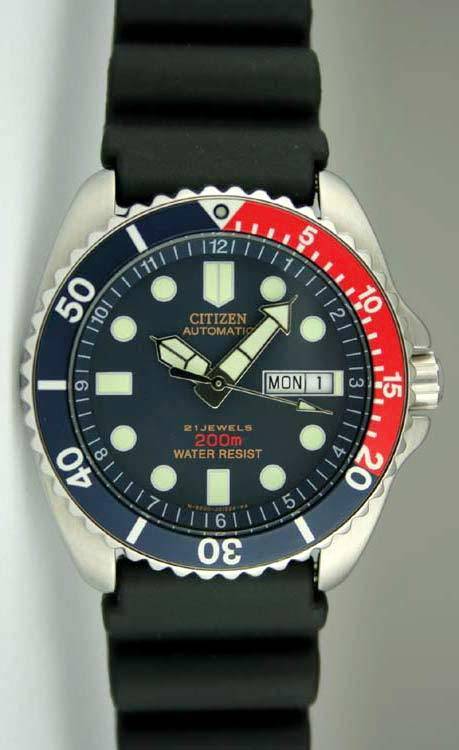 100% Authentic Brand New Citizen Men’s Automatic 200M Scuba Divers Watch, Model No NY2300-09L, Unidirectional Rotate Red & Blue Bezel, Blue Dial with Strong Luminous Hands & Hour markers, Day-Date Calendar at 3o’clock position, Screw lock Crown, 200M Divers, Rubber Band, Screw case back with Japan 21-Jewels Movement.
