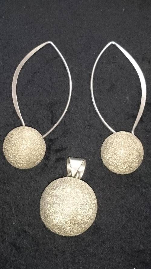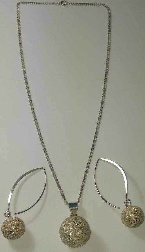 Total weight: 25grams. Size of ball earring: 1.5cm. Length of hook: 4.5cm. Size of ball pendant: 2cm. Good condition. Includes sterling silver chain.