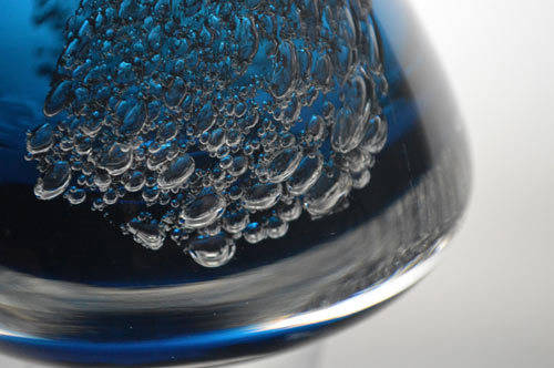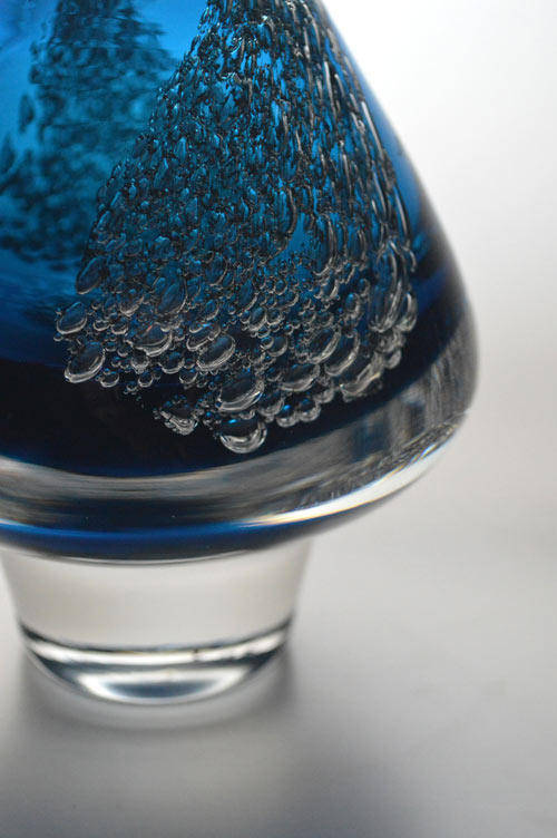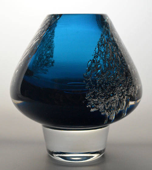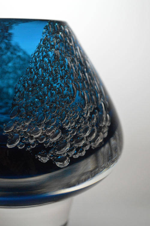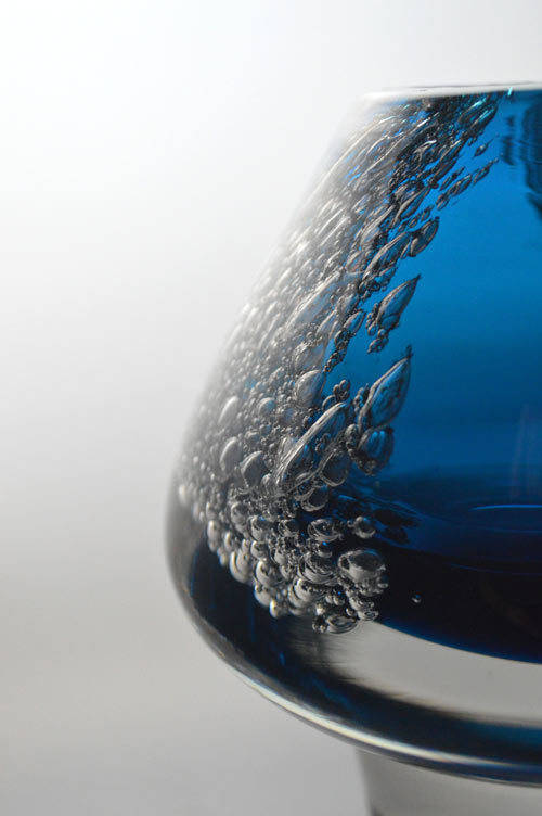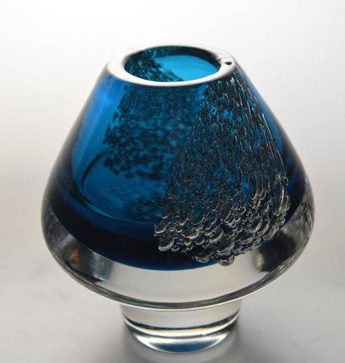 KNOWN AS THE 'FLORIDA' RANGE, IT IS MADE OF CLEAR AND COBALT BLUE GLASS WITH AIR BUBBLE INCLUSIONS GIVING A METALLIC EFFECT