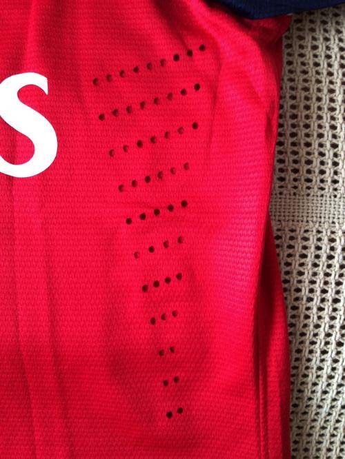 This short sleeve offering features the iconic Arsenal colours of an artillery red body sat next to white sleeves and a navy collar, with the club badge stitched onto the left chest. For a touch more colour, the white sleeves include red and navy bands around the arms. Across the middle of the chest, the Fly Emirates sponsor is printed whilst the Nike swoosh logo is stitched onto the right chest.