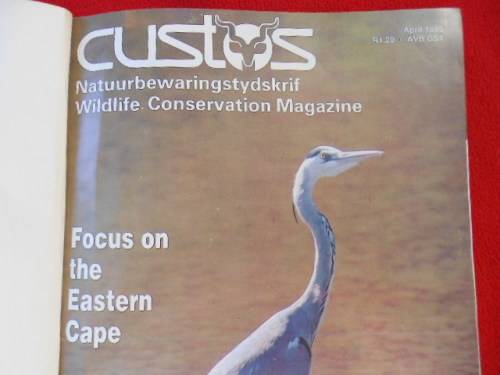 "Custos" National Parks of South Africa hard cover book April 1985-March 1986. 12 issues bound in one green hard covered book. Condition: very good.