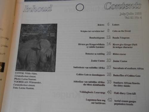 Some of the contents are: Cubs on the Sweni, Bundu Telegram, Rivers give Kruger Park its unique character, Rhino rescue & Butterflies of Golden Gate.