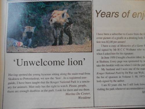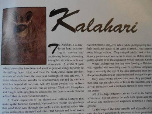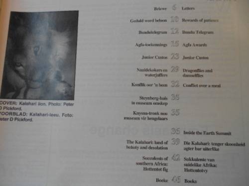 Some of the articles are: Rewards for patience, Bundu Telegram, Agfa Awards, Dragonflies and damselflies, Die Kalahari: tenger skoonheid agter bar uitelike and Sukkulente van suidelike Afrika: Hottentotvy.