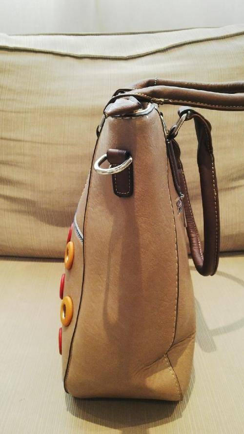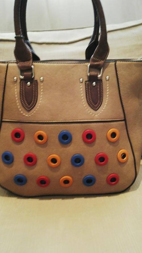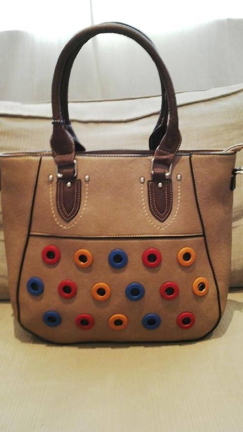 Cute Ladies BEIGE PU Leather Handbag With Pretty Detail & Design...Beautiful Piece!... The bag has a funky colourful button design on the front. This piece can be worn 2 ways, you can carry it on your hand or you can use the straps for a sling style look... Has a double zippered compartment on the inside and cellphone compartments...