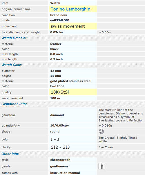 **Diamond**TONINO LAMBORGHINI Brand New Gentlemens Chronograph Watch With Genuine Clean EN033DL.501