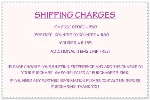 R35.00 Standard shipping using one of our trusted couriers applies to most areas in South Africa. Some areas may attract a R30.00 surcharge. This will be calculated at checkout if applicable.