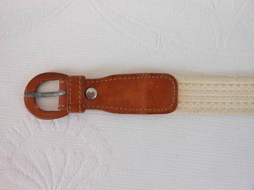 Authentic vintage cream fabric belt with tan natural leather trim. Very good condition, with some signs of wear. To fit waist size 71 cm (smallest hole) to 74.5 cm (largest hole). 2.5 cm wide.